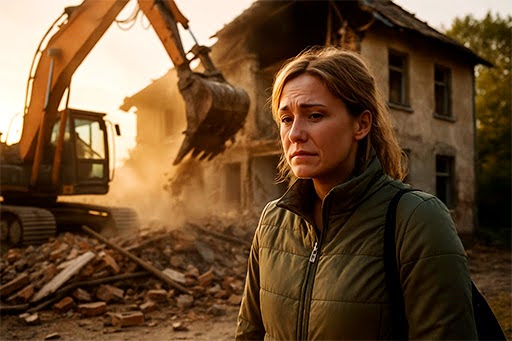 Внезапно в наш неторопливый диалог ворвался грохот стройки, и нам открылось зрелище полуразрушенного дома. Его сносили. И за этим процессом наблюдали любопытные прохожие, которые толпились вокруг. Мы увидели, как промышленный молот безжалостно разбивает стены и дом рушится.